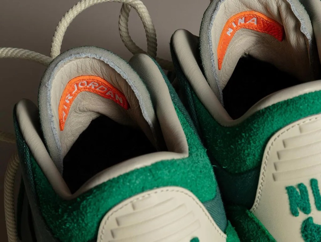 Asimismo, los Nina Chanel Jordan 3 están construidos con parte superior de gamuza y lona de primera calidad, con entresuelas de colores Fossil configuradas para combinar con los cordones, ojales, interiores y el talón personalizado.