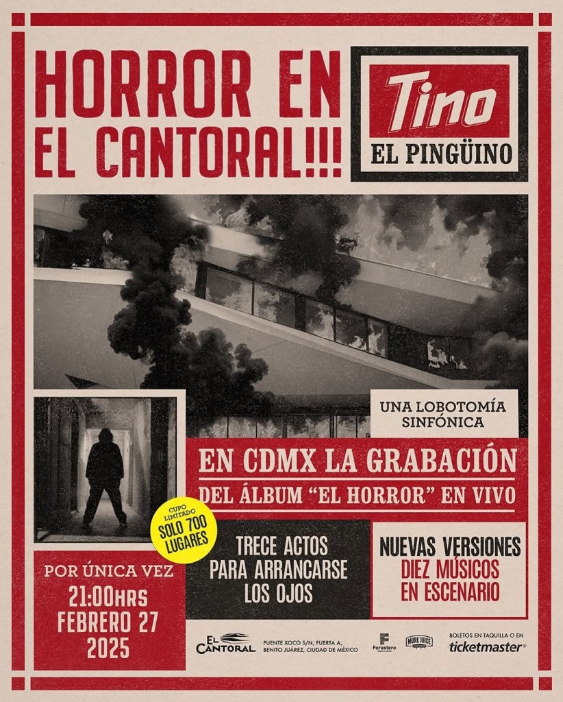 Tino El Pingüino se presentará en el Foro ‘El Cantoral’ el próximo 27 de febrero para grabar una versión en vivo de su más reciente disco ‘El Horror’, con lo que dará inicio a las celebraciones por sus primeros 20 años de carrera.